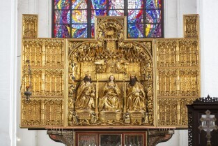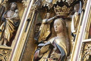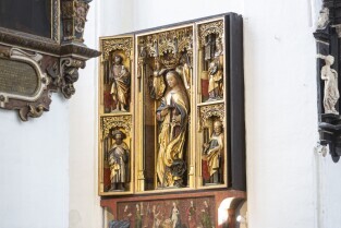 Gdańsk. Wnętrza Bazyliki Mariackiej Wniebowzięcia Najświętszej Maryi Panny w Gdańsku. Nz. Ołtarz św. Barbary.