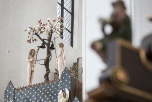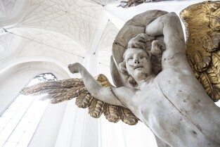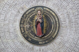 Gdańsk. Elementy wnętrza Bazyliki Mariackiej. Nz. Fragmenty zegara astronomicznego Hansa Duringera. Figury Apastołów i Ewangelistów