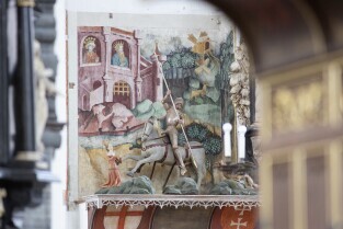Gdańsk. Wnętrza Bazyliki Mariackiej Wniebowzięcia Najświętszej Maryi Panny w Gdańsku. Nz. Figura św. Jerzego walczącego ze smokiem.