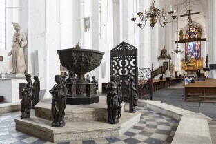 Gdańsk. Wnętrza Bazyliki Mariackiej Wniebowzięcia Najświętszej Maryi Panny w Gdańsku. Nz. Chrzcielnica