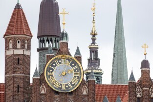 Gdańsk. Wnętrza Bazyliki Mariackiej Wniebowzięcia Najświętszej Maryi Panny w Gdańsku. Nz. Zegar na elewacji północnej.