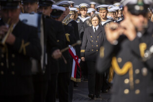 Gdańsk. Uczniowie oraz nauczyciele Zespołu Szkół Morskich przemaszerowali ul.Długą i Długim Targiem. Nz. Wśród maszerujących znalazł się radny Andrzej Kowalczys