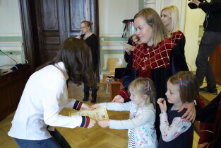 Gdańsk. Dziecięca sesja Rady Miasta Gdańska. Nz. Przewodnicząca Rady Miasta Gdańska Agnieszka Owczarczak i Radne: Katarzyna Czerniewska, Emilia Lodzińska i Kamila Błaszczyk.