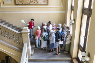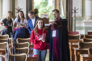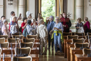 Gdańsk. Dzień Otwarty Rady Miasta. Nz. Po sali obrad rady oprowadzają radni Kamila Błaszczyk i Piotr Gierszewski oraz siedzący w ławach Cezary Śpiewak-Dowbór