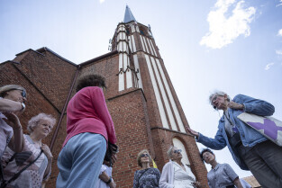 Gdańsk. Po raz 11 mieszkańcy oliwy bawili się na festynie Viva Oliva! odbywającym się co roku na ulicy Opata Jacka Rybickiego. Nz. Lokalna przewodniczka Teresa Polonis-Furmann opowiada o kościele parafialnym Matki Bożej Królowej Korony Polskiej w Oliwie.
