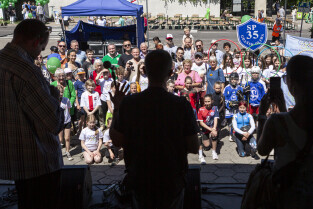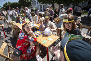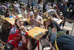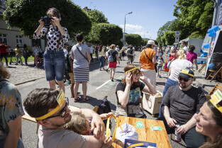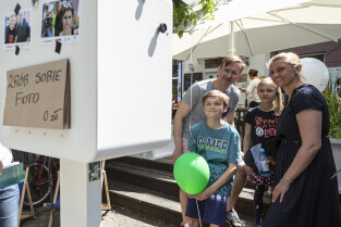 Gdańsk. Po raz 11 mieszkańcy oliwy bawili się na festynie Viva Oliva! odbywającym się co roku na ulicy Opata Jacka Rybickiego. Nz. Członkowie Gdańskiego Towarzystwa Fotograficznego robią wspólną fotografię uczestników festynu.