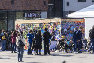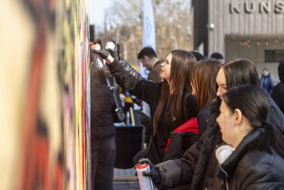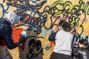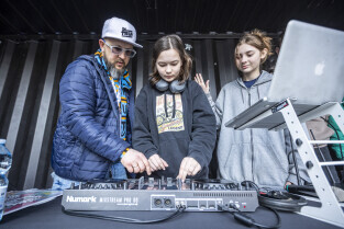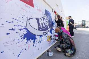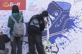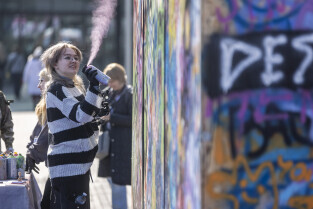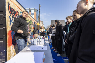 Gdańsk. Na dziedzińcu galerii handlowej Forum Gdańsk oraz w Kunszcie Wodnym odbył się Wielki Finał IV edycji kampanii Niebieskie Trampki. Nz. Artysta Marek Rybowski "Looney"" prowadzący warsztaty graffiti