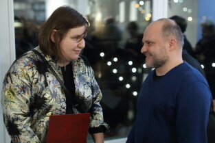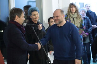 Gdańsk. Finisaż 5. edycji Gdańskiego Biennale Sztuki. Spośród artystów, którzy zakwalifikowali się na wystawę został wyłoniony zwycięzca Biennale oraz laureat Nagrody Publiczności. Nz. Krzysztof Polkowski-Rektor ASP i Dominik Włodarek.