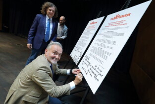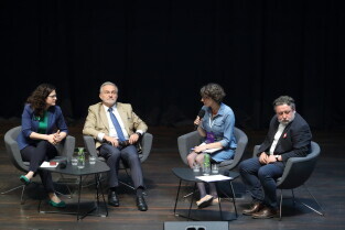 Gdańsk, Europejskie Centrum Solidarności. Forum Praktyków Partycypacji. Nz. Prezydent Gdyni Wojciech Szczurek, Prezydent Gdańska Aleksandra Dulkiewicz i Dyrektor ECS Basil Kerski.