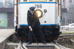 Gdańsk. W zajezdni tramwajowej na ul. Wita Stwosza odbyła się prezentacja odrestaurowanego tramwaju DWF Tw245 "Bergmann" z 1927 roku. Nz. Cezary Kamiński, motorniczy Gdański Autobusów i Tramwajów, prezes Stowarzyszenia Grupa Tramwajowo-Autobusowa WPK GG