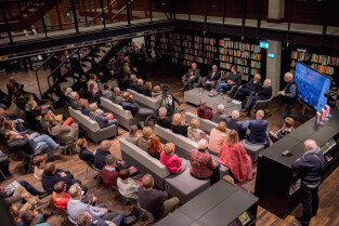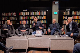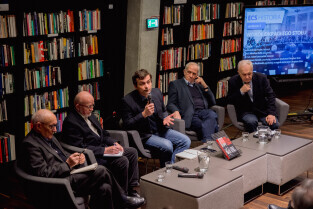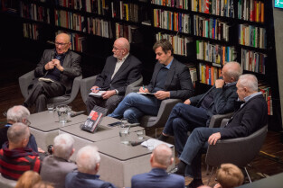 Gdańsk. ECS Historia 4. Wokół Okrągłego Stołu. Nz. od l. : prof. Janusz Reykowski, prof. Janusz Grzelak, dr hab. Adam Leszczyński, prof. Andrzej Friszke oraz prof. Mirosław Kofta