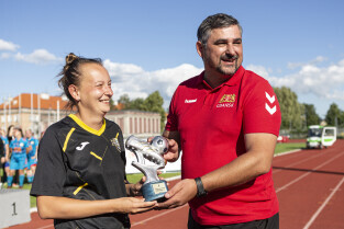 Gdańsk. Finał III Kobiecego Turnieju Piłkarskiego, który odbył się na terenie Gdańskiego Ośrodka Kultury Fizycznej. Nz. Marcin Jędryczka, Dyrektor Gdańskiego Klubu Sportowego Gedania 1922 wręcza nagrody najlepszym zawodniczkom turnieju.