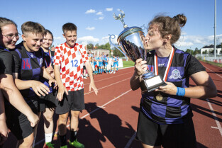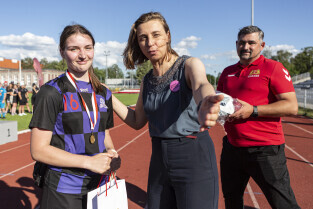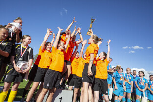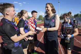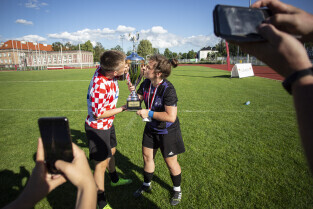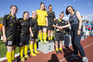 Gdańsk. Finał III Kobiecego Turnieju Piłkarskiego, który odbył się na terenie Gdańskiego Ośrodka Kultury Fizycznej. Nz. Wiceprezydent Monika Chabior wręcza nagrody dla drużyn oraz wyróżnionych zawodniczek.