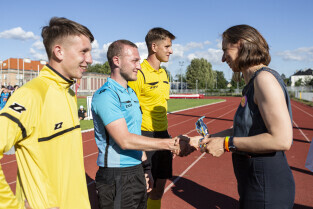 Gdańsk. Finał III Kobiecego Turnieju Piłkarskiego, który odbył się na terenie Gdańskiego Ośrodka Kultury Fizycznej. Nz. Wiceprezydent Monika Chabior wręcza nagrody arbitrom turnieju.
