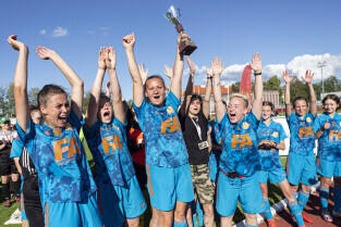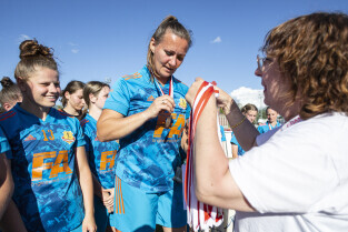 Gdańsk. Finał III Kobiecego Turnieju Piłkarskiego, który odbył się na terenie Gdańskiego Ośrodka Kultury Fizycznej. Nz. Zawodniczki Olimpii Czersk odbierają z rąk wiceprezydent Moniki Chabior puchar za zajęcie II miejsca