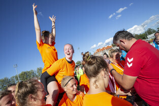 Gdańsk. Finał III Kobiecego Turnieju Piłkarskiego, który odbył się na terenie Gdańskiego Ośrodka Kultury Fizycznej. Nz. Zawodniczki drużyny Kamizelki Gdańsk odnierają z rąk wiceprezydent Moniki Chabior puchar za zajęcie I miejsca w turnieju.
