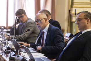 Gdańsk. III Sesja Rady Miasta. Nz. Radni PiS, Aleksander Jankowski, Piotr Gierszewski, Kazimierz Koralewski i Tomasz Rakowski
