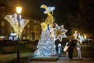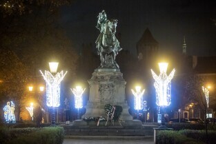 Gdańsk. Świąteczne iluminacje na Placu im. Dariusza Kobzdeja, na ulicy Szerokiej oraz przy pomniku Jana III Sobieskiego. Nz. Rozświetlony pomnik Jana III Sobieskiego
