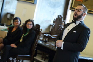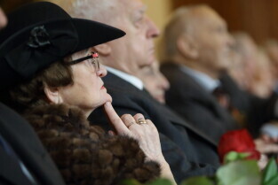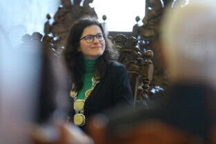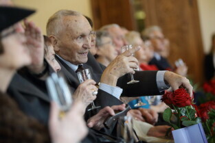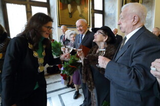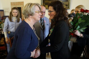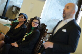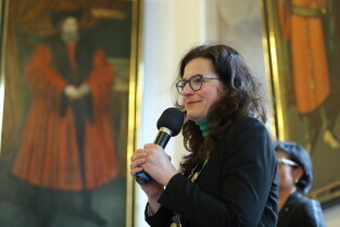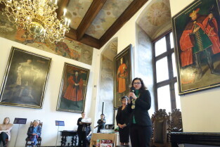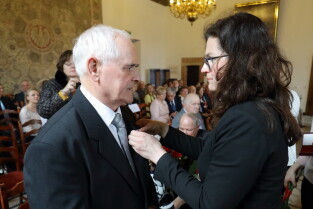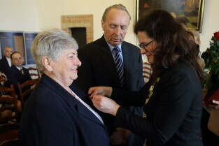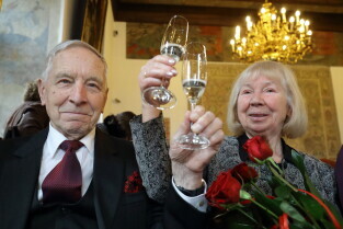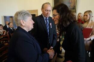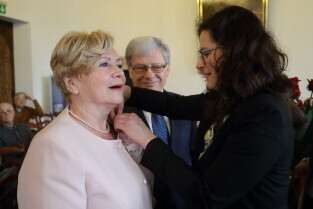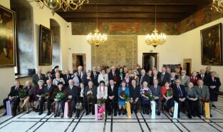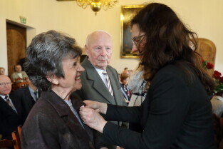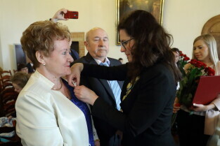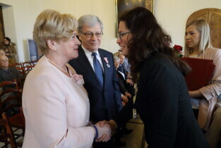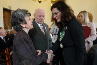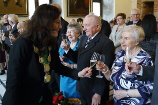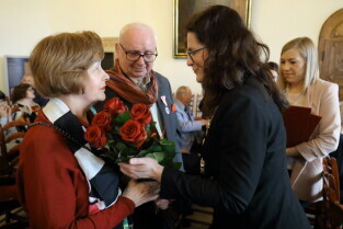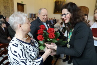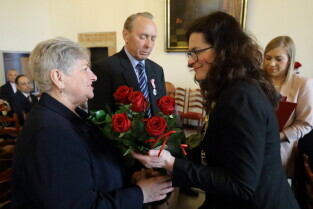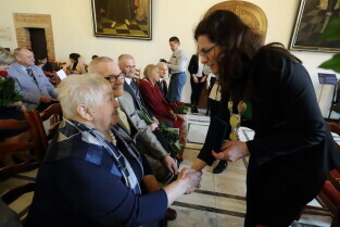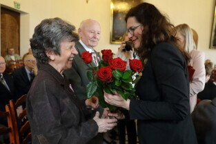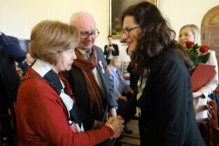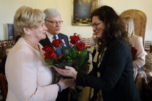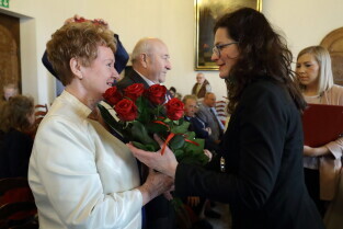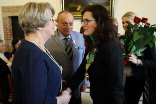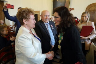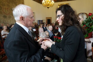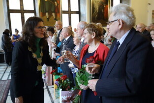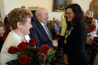 Gdańsk. Ratusz Głównego Miasta. Jubileusz Par Małżeńskich - "Złote Gody", podczas których Prezydent Gdańska Aleksandra Dulkiewicz wręczyła medale za długoletnie pożycie małżeńskie.
