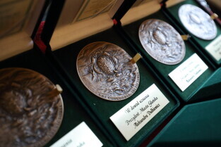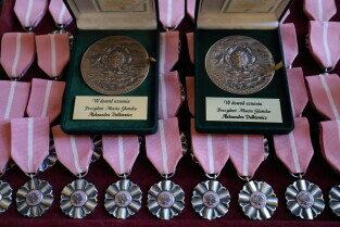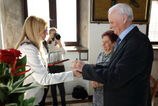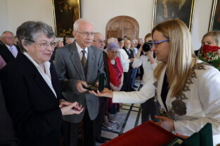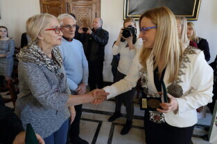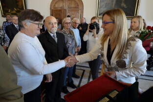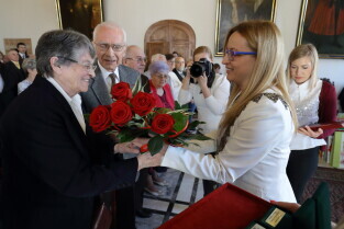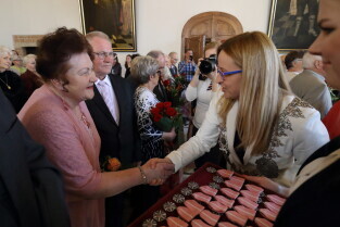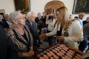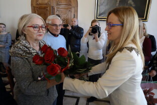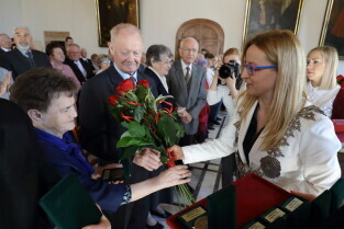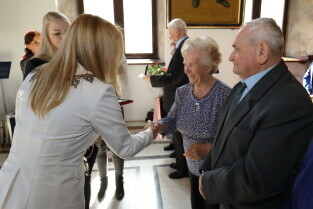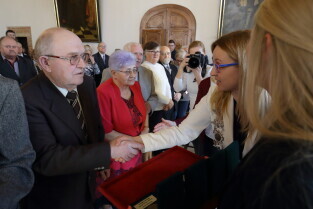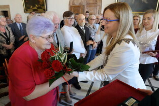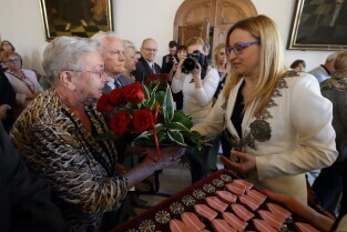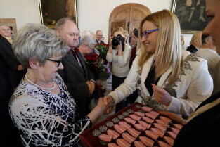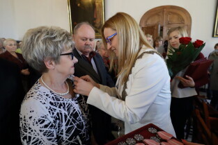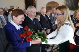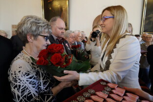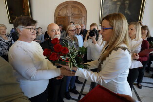 Gdańsk. Ratusz Głównego Miasta. Jubileusz Par Małżeńskich - "Złote Gody", podczas których Przewodnicząca Rady Miasta Gdańska Agnieszka Owczarczak wręczyła medale za długoletnie pożycie małżeńskie.