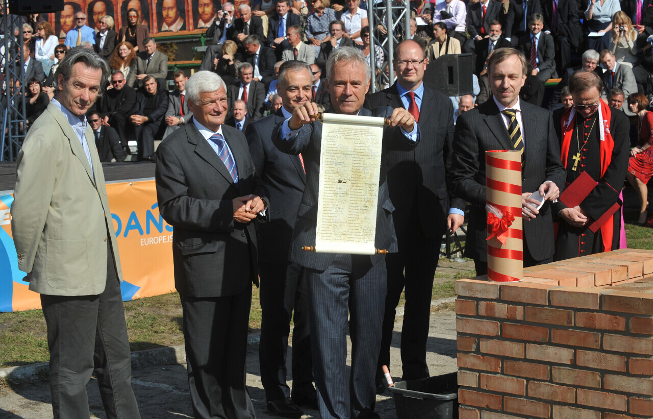 Gdansk. Wmurowania kamienia wegielnego pod budowe Teatru Szekspirowskiego w Gdansku. Nz Renato Rizzi ( architekt, autor projektu ), Jan Kozlowski ( Marszalek Wojewodztwa Pomorskiego ), Zbigniew Canowiecki ( Wiceprzewodniczacy Rady Regionalnej Izby Gospodarczej Pomorza ), prof. Jerzy Limon ( dyrektor Gdanskiego Teatru Szekspirowskiego ), Pawel Adamowicz ( Prezydent Miasta Gdanska ), , Bogdan Zdrojewski ( Minister Kultury i Dziedzictwa Narodowego ). 14.09.2009 fot. Maciej Kosycarz / KFP
