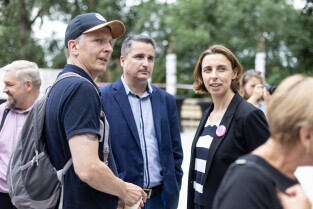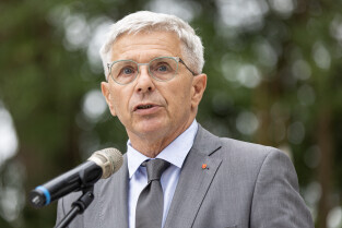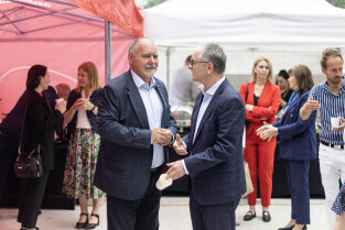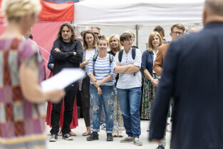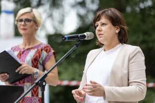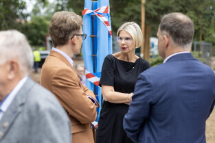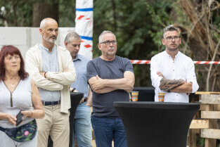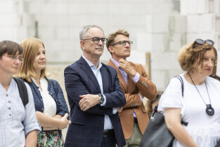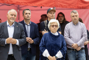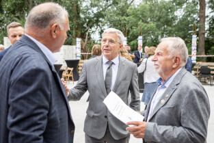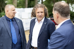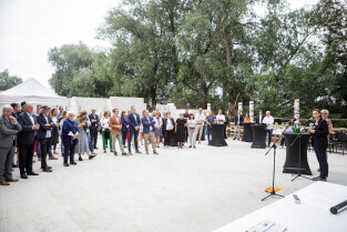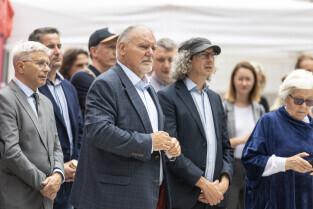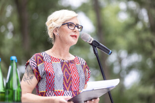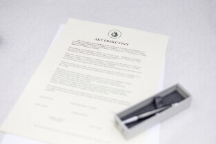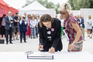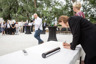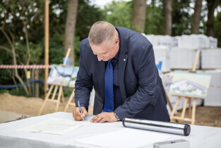 Uroczystość podpisania aktu erekcyjnego i wmurowania kamienia węgielnego pod schronisko dla bezdomnych mężczyzn w Przegalinie.