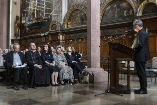 Gdańsk. Ekumeniczne nieszpory i muzyka dawnych gdańskich kompozytorów na powitanie gotyckiego ołtarza Pietas Domini w Bazylice Mariackiej. Nz. Przy mikrofonie ks. Ireneusz Bradtke, proboszcz Bazyliki Mariackiej w trakcie sesji naukowej w Dworze Artusa poświęconej ołtarzowi.
