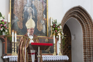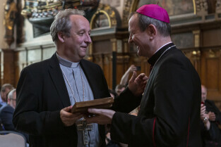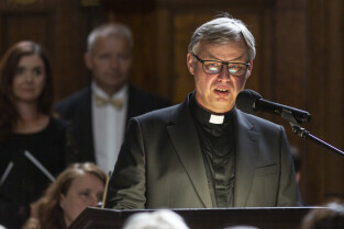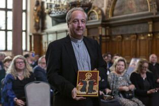 Gdańsk. Ekumeniczne nieszpory i muzyka dawnych gdańskich kompozytorów na powitanie gotyckiego ołtarza Pietas Domini w Bazylice Mariackiej. Nz. Ewangelicki biskup Christian Stäblein