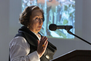 Gdańsk. Ekumeniczne nieszpory i muzyka dawnych gdańskich kompozytorów na powitanie gotyckiego ołtarza Pietas Domini w Bazylice Mariackiej. Nz. prof. Elżbieta Pilecka z Uniwersytetu Mikołaja Kopernika w Toruniu - znawczyni sztuki gotyckiej w trakcie sesji naukowej w Dworze Artusa poświęconej ołtarzowi.
