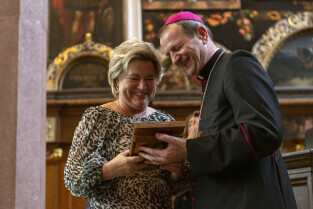 Gdańsk. Ekumeniczne nieszpory i muzyka dawnych gdańskich kompozytorów na powitanie gotyckiego ołtarza Pietas Domini w Bazylice Mariackiej. Nz. Cornelia Pieper, pani konsul generalna Niemiec w Gdańsku oraz Abp. Tadeusz Wojda