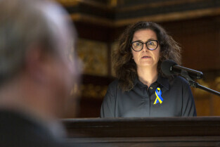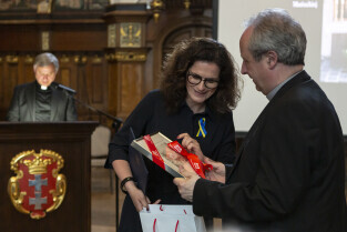 Gdańsk. Ekumeniczne nieszpory i muzyka dawnych gdańskich kompozytorów na powitanie gotyckiego ołtarza Pietas Domini w Bazylice Mariackiej. Nz. Prezydent Aleksandra Dulkiewicz w trakcie sesji naukowej w Dworze Artusa poświęconej ołtarzowi.