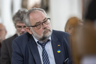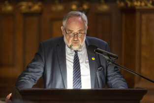 Gdańsk. Ekumeniczne nieszpory i muzyka dawnych gdańskich kompozytorów na powitanie gotyckiego ołtarza Pietas Domini w Bazylice Mariackiej. Nz. poseł Piotr Adamowicz w trakcie sesji naukowej w Dworze Artusa poświęconej ołtarzowi.