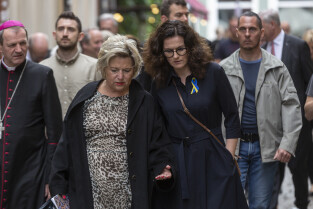 Gdańsk. Ekumeniczne nieszpory i muzyka dawnych gdańskich kompozytorów na powitanie gotyckiego ołtarza Pietas Domini w Bazylice Mariackiej. Nz. Prezydent Aleksandra Dulkieiwcz i ks. Ireneusz Bradtke, proboszcz Bazyliki Mariackiej.