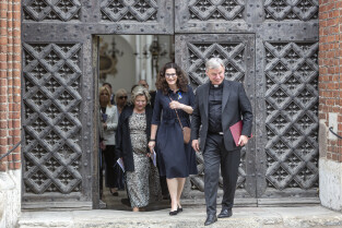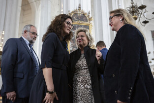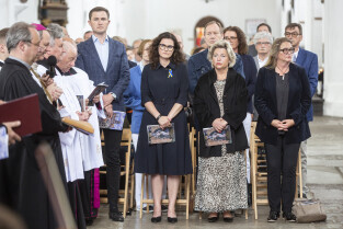 Gdańsk. Ekumeniczne nieszpory i muzyka dawnych gdańskich kompozytorów na powitanie gotyckiego ołtarza Pietas Domini w Bazylice Mariackiej. Nz. Zastępca prezydenta Piotr Grzelak, Prezydent Aleksandra Dulkiewicz, Cornelia Pieper, pani konsul generalna Niemiec w Gdańsku oraz Katrin Budde przewodnicząca komisji kultury i środków przekazu w niemieckim Bundestagu.