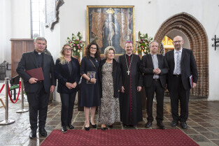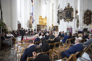 Gdańsk. Ekumeniczne nieszpory i muzyka dawnych gdańskich kompozytorów na powitanie gotyckiego ołtarza Pietas Domini w Bazylice Mariackiej. Nz. ks. Ireneusz Bradtke, proboszcz Bazyliki Mariackiej, Katrin Budde przewodnicząca komisji kultury i środków przekazu w niemieckim Bundestagu, Prezydent Aleksandra Dulkiewicz, Cornelia Pieper, pani konsul generalna Niemiec w Gdańsku, Abp. Tadeusz Wojda, Ewangelicki biskup Christian Stäblein oraz Dr Martin Evang nadradca kościoła ewangielickiego.