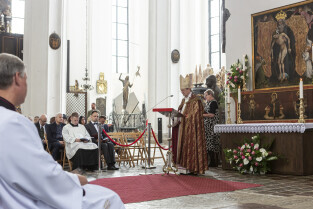 Gdańsk. Ekumeniczne nieszpory i muzyka dawnych gdańskich kompozytorów na powitanie gotyckiego ołtarza Pietas Domini w Bazylice Mariackiej. Nz. Abp. Tadeusz Wojda