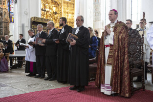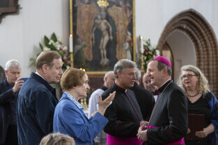 Gdańsk. Ekumeniczne nieszpory i muzyka dawnych gdańskich kompozytorów na powitanie gotyckiego ołtarza Pietas Domini w Bazylice Mariackiej. Nz. Ewangelicki biskup Christian Stäblein oraz Abp. Tadeusz Wojda