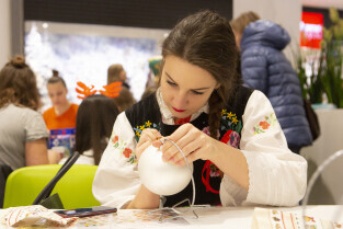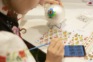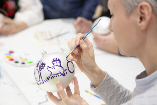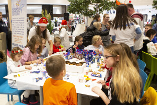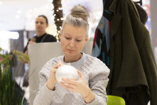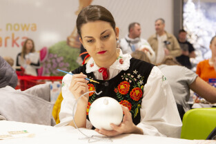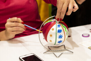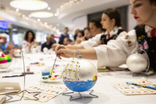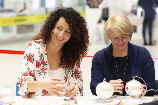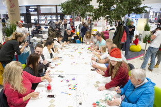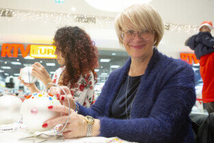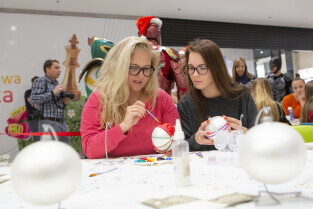 Malowanie bombek z gwiazdami na licytację na rzecz Pomorskiego Hospicjum dla dzieci. Gdańsk, Centrum Handlowe Morena