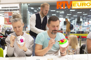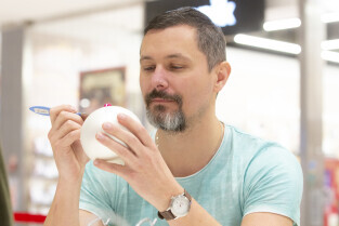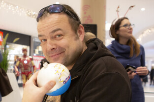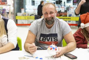 Malowanie bombek z gwiazdami na licytację na rzecz Pomorskiego Hospicjum dla dzieci. Gdańsk, Centrum Handlowe Morena. Nz. Artur Siudmiak