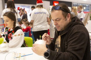 Malowanie bombek z gwiazdami na licytację na rzecz Pomorskiego Hospicjum dla dzieci. Gdańsk, Centrum Handlowe Morena. Nz. Cezary Zybała Strzelecki