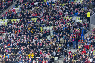 Gdańsk. Polki grały na stadionie Polsat Plus Arena z reprezentacją Holandii w meczu eliminacyjnym do Mistrzostw Świata w piłce nożnej kobiet. Nz. Kibice