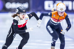 Gdańsk. Na lodowisku hokejowym w hali Olivia odbyły się Mistrzostwa Europy w Short Tracku, w biegach na 500, 1000 i 1500 metrów rywalizują zawodniczki i zawodnicy z całej europy. Nz. Z numerem 15 reprezentant polski Diane Sellier