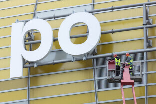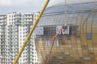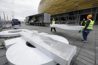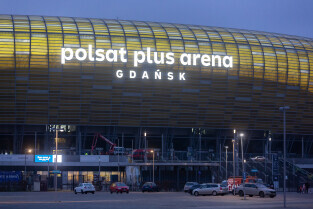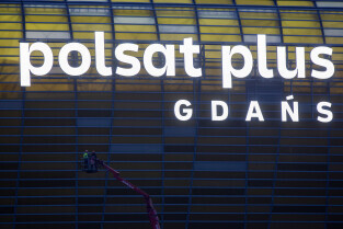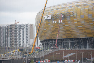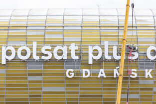 Montaż nazwy Polsat Plus Arena Gdańsk na stadionie w Letnicy
