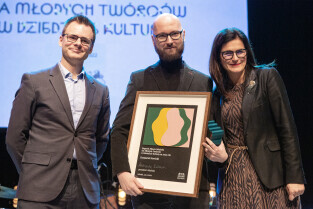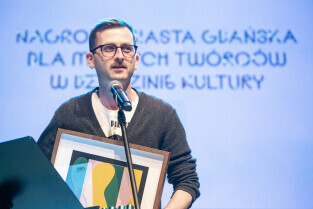 Gdańsk. W klubie Żak odbyła się uroczystość wręczenia Nagrody Miasta Gdańska dla Młodych Twórców w Dziedzinie Kultury. Nz. Nagrodę odbiera Krzysztof Nowicki.