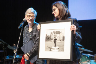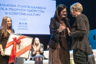 Gdańsk. W klubie Żak odbyła się uroczystość wręczenia Nagrody Miasta Gdańska dla Młodych Twórców w Dziedzinie Kultury. Nz. Z okazji 65 rocznicy powstania Klubu Żak Prezydent Gdańska Aleksandra Dulkiewicz wręczyła jego Dyrektorce Magdalenie Renk-Grabowskiej zdjęcie historycznej siedziby klubu przy ul.Wały Jagiellońskie wykonane przez Zbigniewa Kosycarza.