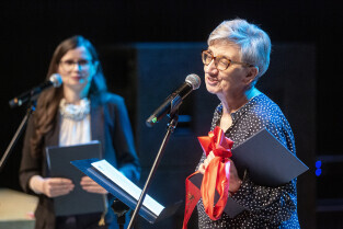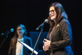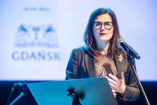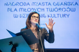 Gdańsk. W klubie Żak odbyła się uroczystość wręczenia Nagrody Miasta Gdańska dla Młodych Twórców w Dziedzinie Kultury. Nz. Prezydent Aleksandra Dulkiewicz
