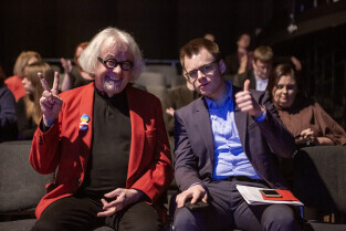 Gdańsk. W klubie Żak odbyła się uroczystość wręczenia Nagrody Miasta Gdańska dla Młodych Twórców w Dziedzinie Kultury. Nz. Radni Andrzej Stelamsiewicz i Jan Perucki