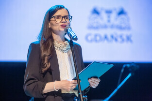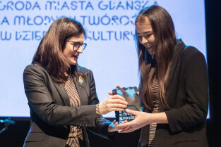 Gdańsk. W klubie Żak odbyła się uroczystość wręczenia Nagrody Miasta Gdańska dla Młodych Twórców w Dziedzinie Kultury. Nz. nagrodę odbiera Julia Tymańska.