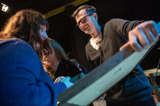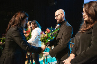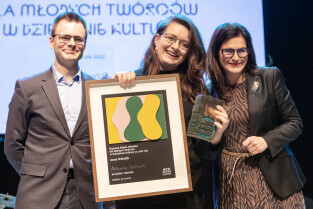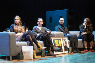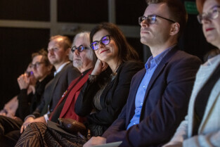 Gdańsk. W klubie Żak odbyła się uroczystość wręczenia Nagrody Miasta Gdańska dla Młodych Twórców w Dziedzinie Kultury. Nz. Prezydent Gdańska Alekandra Dulkiewicz rozmawia z laureatami nagrody.