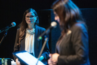 Gdańsk. W klubie Żak odbyła się uroczystość wręczenia Nagrody Miasta Gdańska dla Młodych Twórców w Dziedzinie Kultury. Nz. Nagrodę odbiera Anna Wakulik.